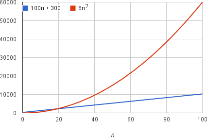 - 위의 그래프처럼 100n + 300과 6n2의 성장률을 볼 때, n2의 성장률이 기하급수적으로 커진다. 즉 입력이 커질 수록 n2의 실행 시간이 기하급수적으로 느려짐을 알 수 있다.
