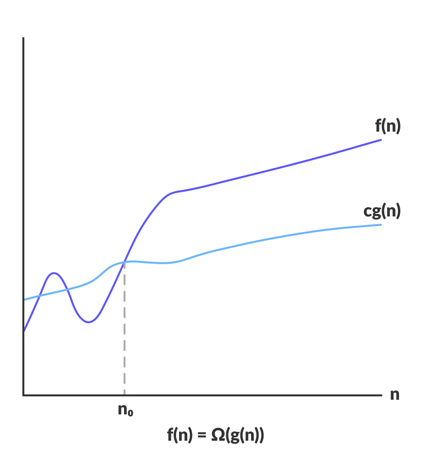 - 모든 n, n0에 대해서 f(n) >= cg(n)인 조건을 만족시키는 두 양의 상수 c와 n0가 존재한다면 f(n) ∈ Ω(g(n))이다. 이를 관행적으로 f(n) = Ω(g(n))이라고 쓴다.