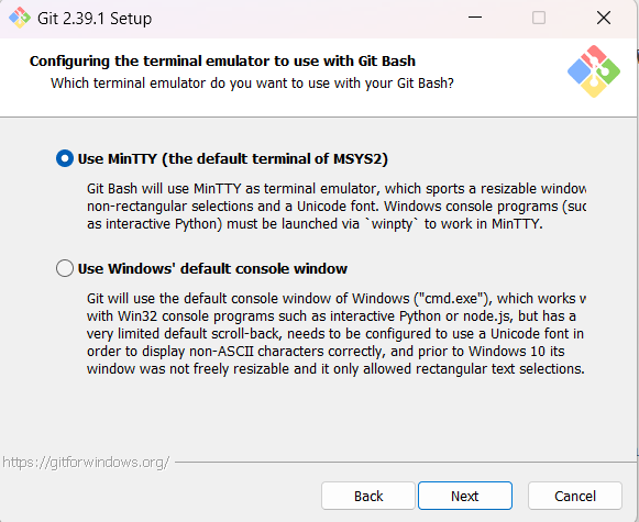 깃의 터미널 애뮬레이터 선택하는 부분. 기본 값 설정되었으니 넥스트~