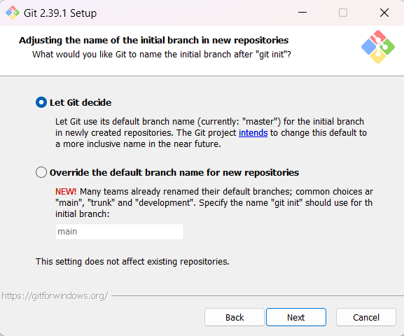 디폴트 브랜치의 이름을 master로 정하게 하는 부분이다. 이쯤되면 안봐도 그냥 next~