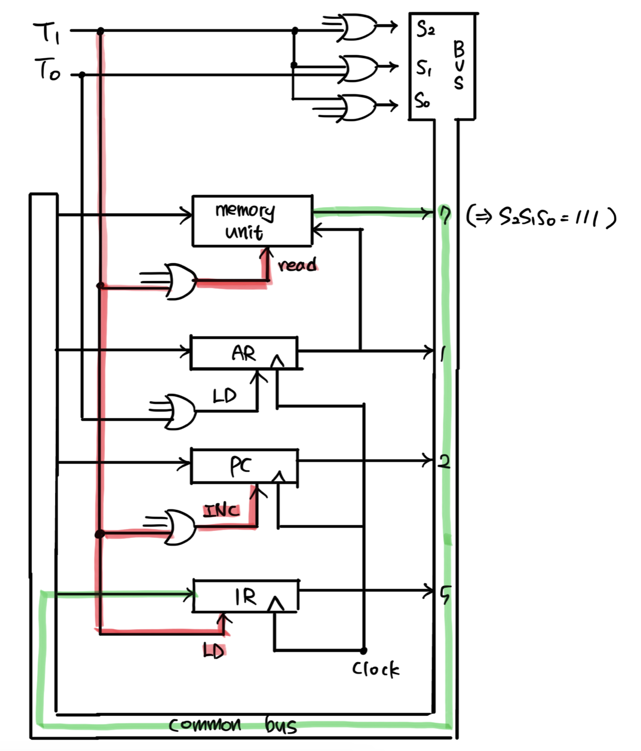 T1 시간에 메모리로부터 읽어온 명령어는 IR(Instruction register)에 저장된다. 맨 처음, 메모리의 읽기 입력을 인에이블한다. S2S1S0를 111로 두어 메모리의 내용이 버스를 타고 LD 입력을 인에이블 시킨 상태인 IR로 전송한다. 동시에 PC는 1이 증가된다. PC는 다음 명령어를 가져와야 하므로 자동으로 1씩 증가한다.(INC는 버스를 사용할 필요가 없기 때문에 T1 시간에 동시에 두 마이크로 명령이 실행이 가능하다.)