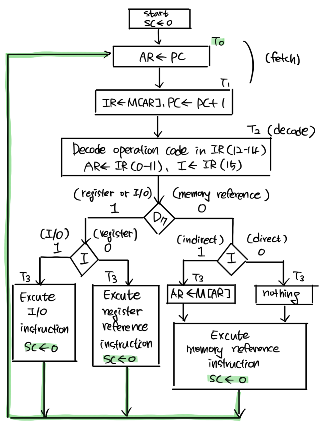 - 모든 명령을 실행하고 나면 다시 처음 단계인 fetch로 넘어가기 위해서 SC 값을 0으로 클리어 하므로 T0 타이밍이 된다. 이는 SC ← 0으로 표현한다.