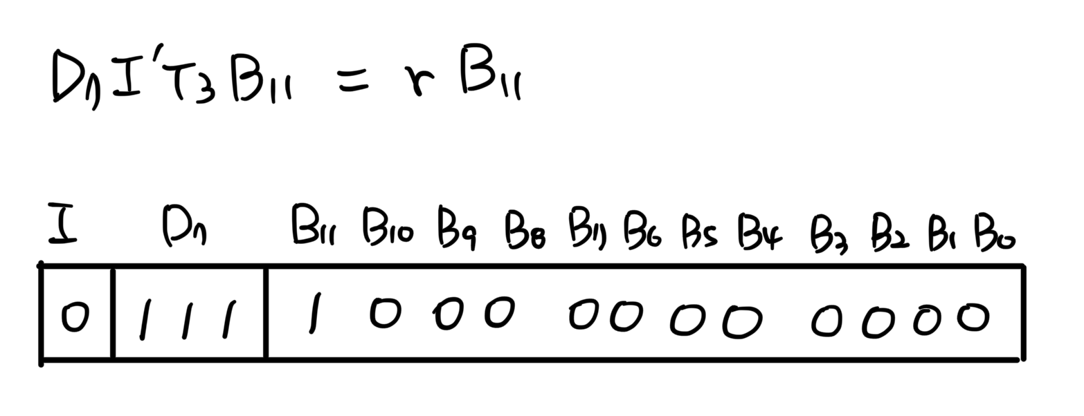 - 예를 들어 명령어 코드가 16진수로 7800이라고 하면 이는 2진수로 0111 1000 0000 0000이 될 것이다. IR(0-11) 레지스터의 각 비트는 Bi로 표시한다. 2진수로 표현한 코드의 각각을 보면 I', D7, B11이 1의 값을 가진다. 모든 제어 함수는 이러한 부울식이 필요하다. 간단히 기호 r로 표현한다. 따라서 7800 코드의 제어 함수는 D7I'T3B11이 된다. 혹은 rB11로 표현할수 있다.