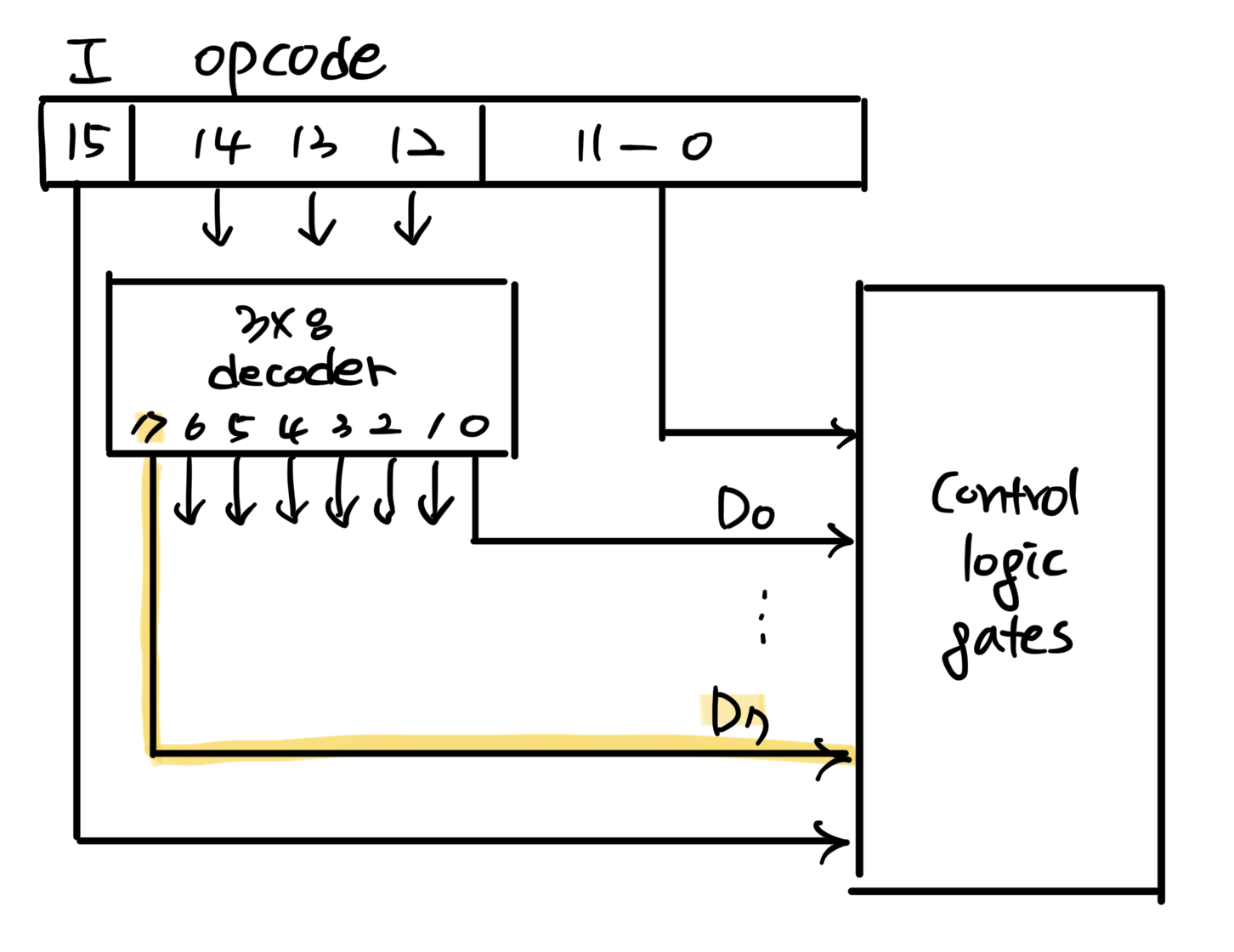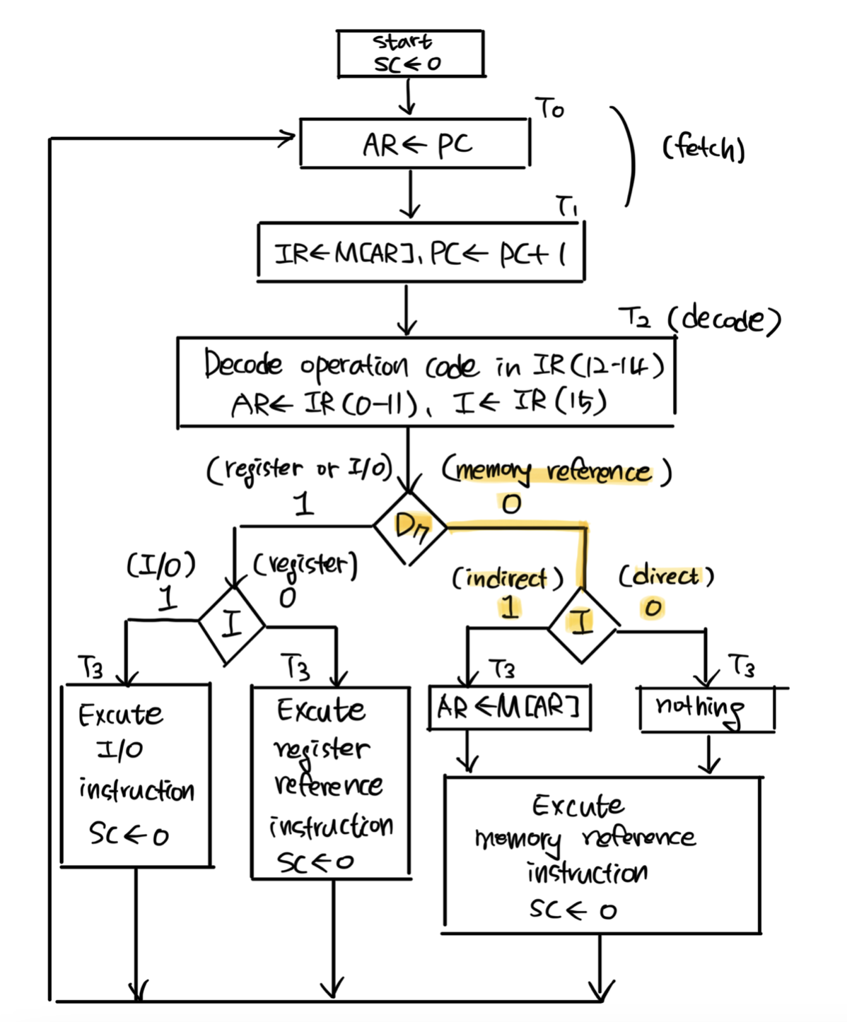 - 만약 D7이 1이면 opcode가 111이라는 뜻이므로 레지스터 참조 명령이거나 입출력 명령일 것이다.(이는 I 값에 따라 바뀔 것이다.) D7이 0이라면 opcode가 111이 될 수 없으므로 (000~110 중에 하나라는 것이므로) 메모리 참조 명령이라는 뜻이다.