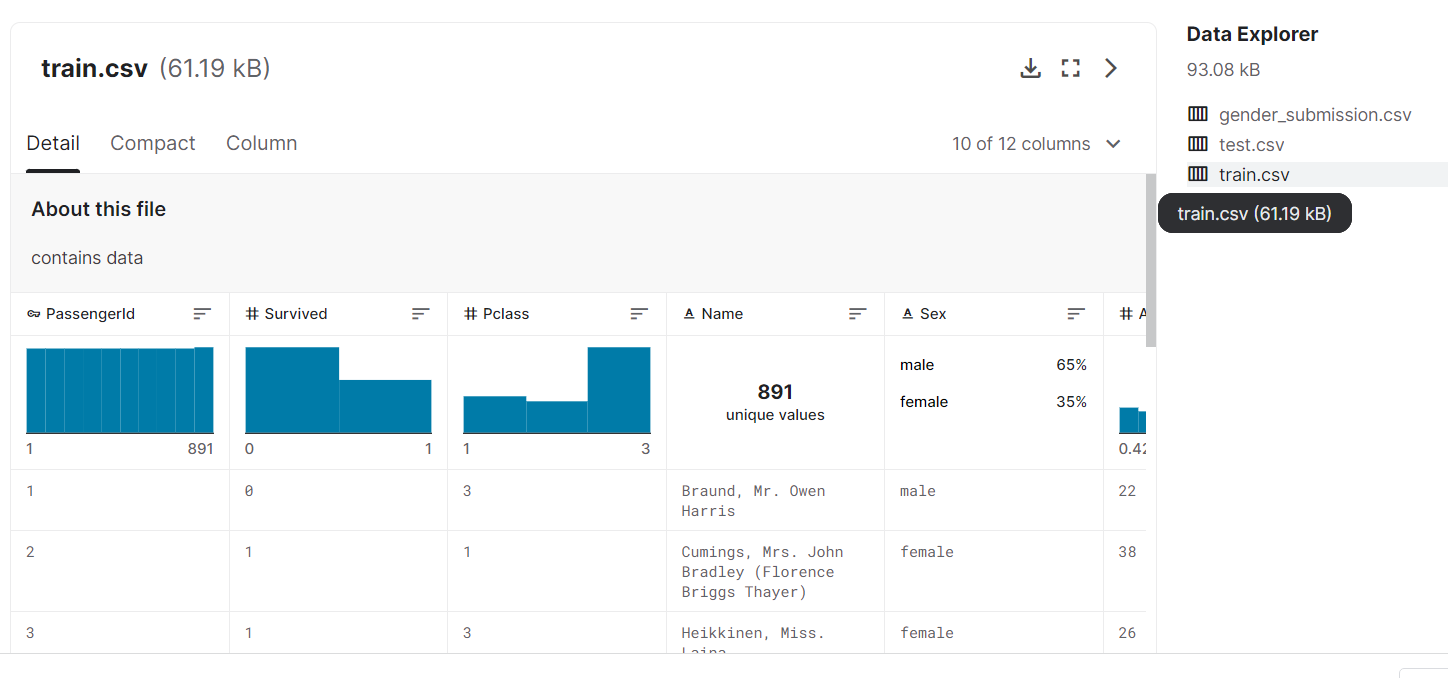 ▶ train.csv를 열어보면 첫 줄에 파일의 칼럼명이 나열되어 있고 각 칼럼은 콤마(,)로 구분되어 있다.[PassengerId,Survived,Pclass,Name,Sex,Age,SibSp,Parch,Ticket,Fare,Cabin,Embarked]