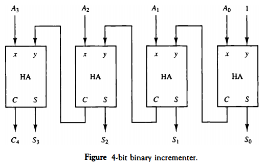 - 카운트 enable이 활성화될 때 클럭 펄스의 변이에 의해 레지스터 값이 하나씩 증가하게 된다. 하지만 인크리멘트 연산은 특정한 레지스터와 관계없이 조합 회로에 의해서 수행되어야 하는 경우가 있다. 그럴 경우 반가산기(half adder : HA)를 직렬로 연결하여 위 그림과 같이 구현한다.