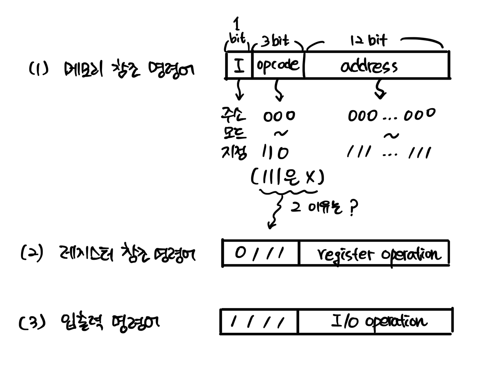 - 실제로 레지스터 참조 명령이나 입출력 명령에서 4bit를 사용하고 나면 남은 12bit가 연산 코드가 되므로 실제로는 더 많은 연산이 가능하지만 위의 표에서는 몇 가지만 소개하고 있다. 상용화된 컴퓨터에서는 더 복잡하고 완전한 형태의 명령어들이 있겠다.